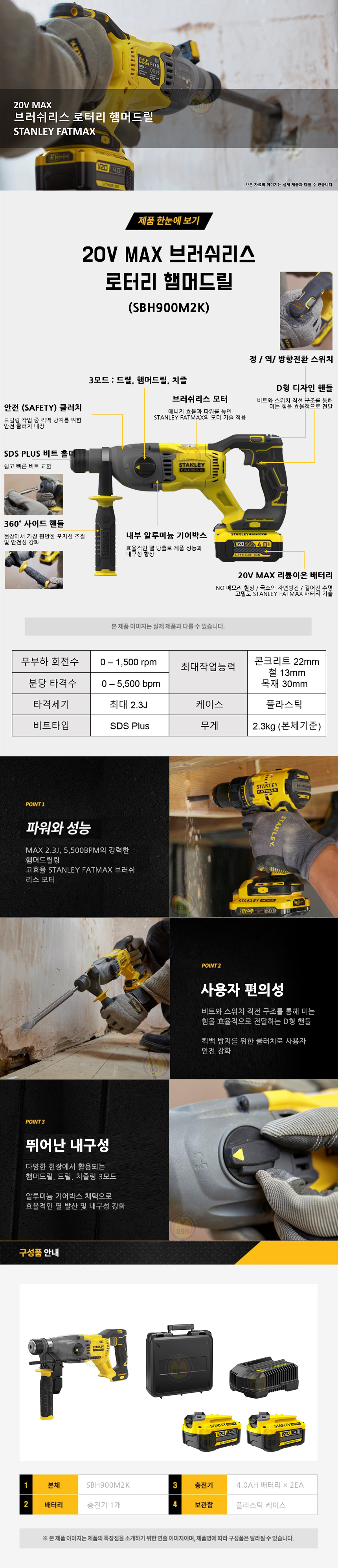 스탠리 20V 충전햄머드릴 SBH900M2K(4Ah,2B) 충전 SDS햄머 SDS드릴 해머드릴 함마드릴