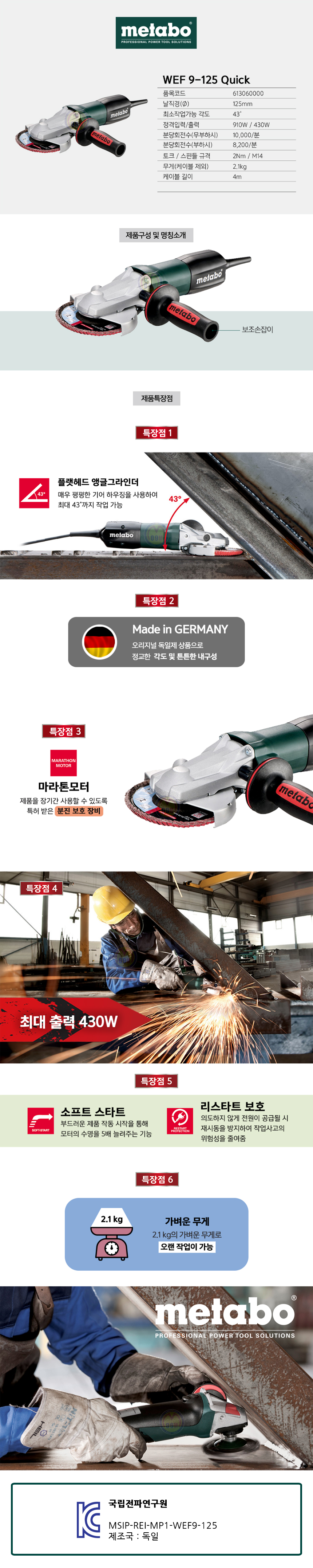 메타보 플랫헤드 그라인더 WEF9-125 Quick (125mm-910W) 그라인더 절단기
