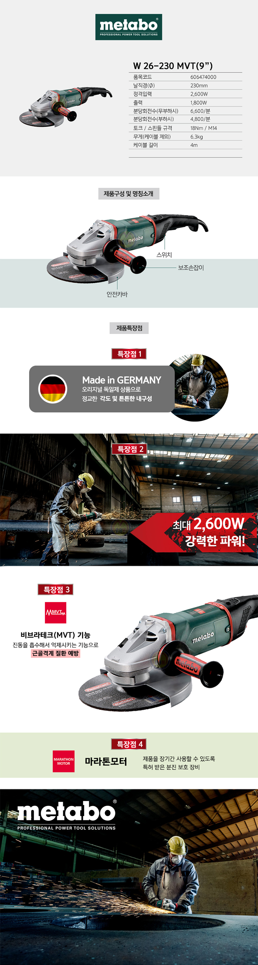 메타보 대형 그라인더 W 26-230 MVT (225mm-2600W) 그라인더 절단기