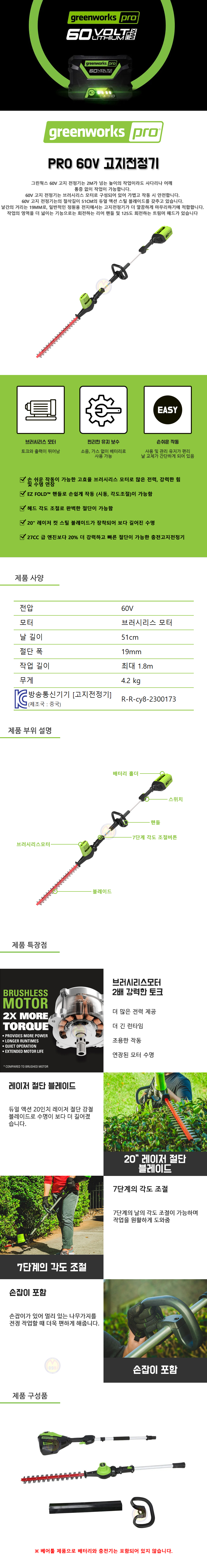 그린웍스 60V 073 전정기 (5Ah1개 세트) 헤지트리머, 충전트리머, 전동전정기, 가지치기