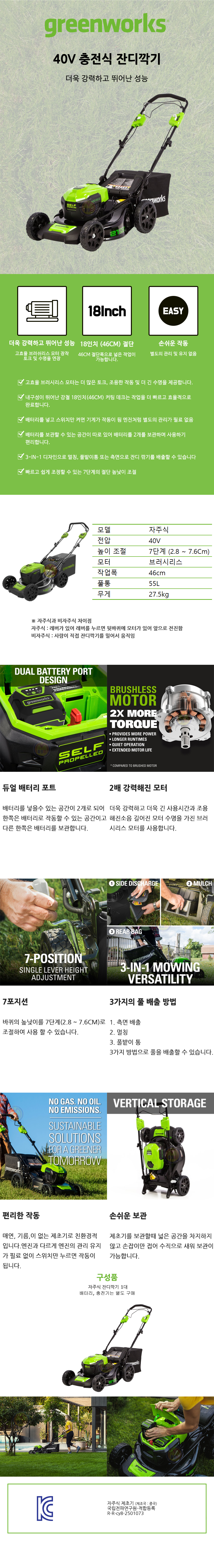 그린웍스 듀얼잔디깍기(자동) 40V-5Ah1개 세트, 충전식 제초기 잔디깍기