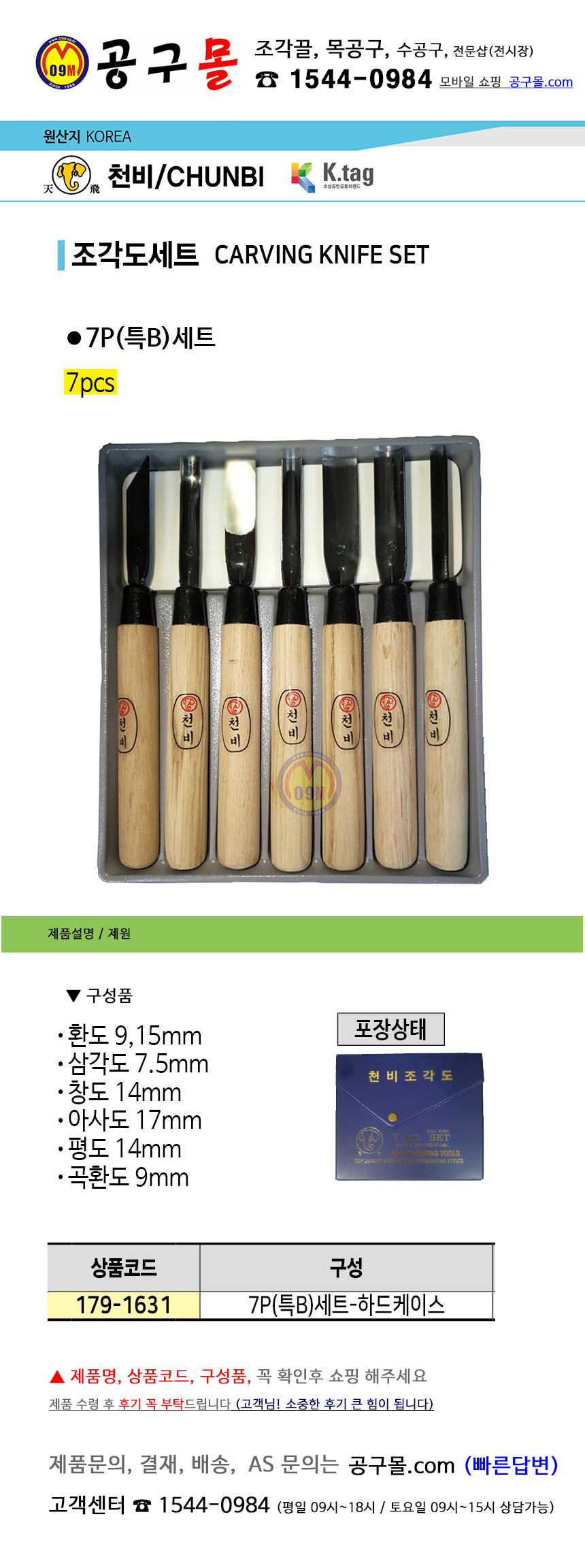 천비 조각도세트 7P(특B) 하드케이스, 공구몰, 조각칼, 목공구, 179-1631