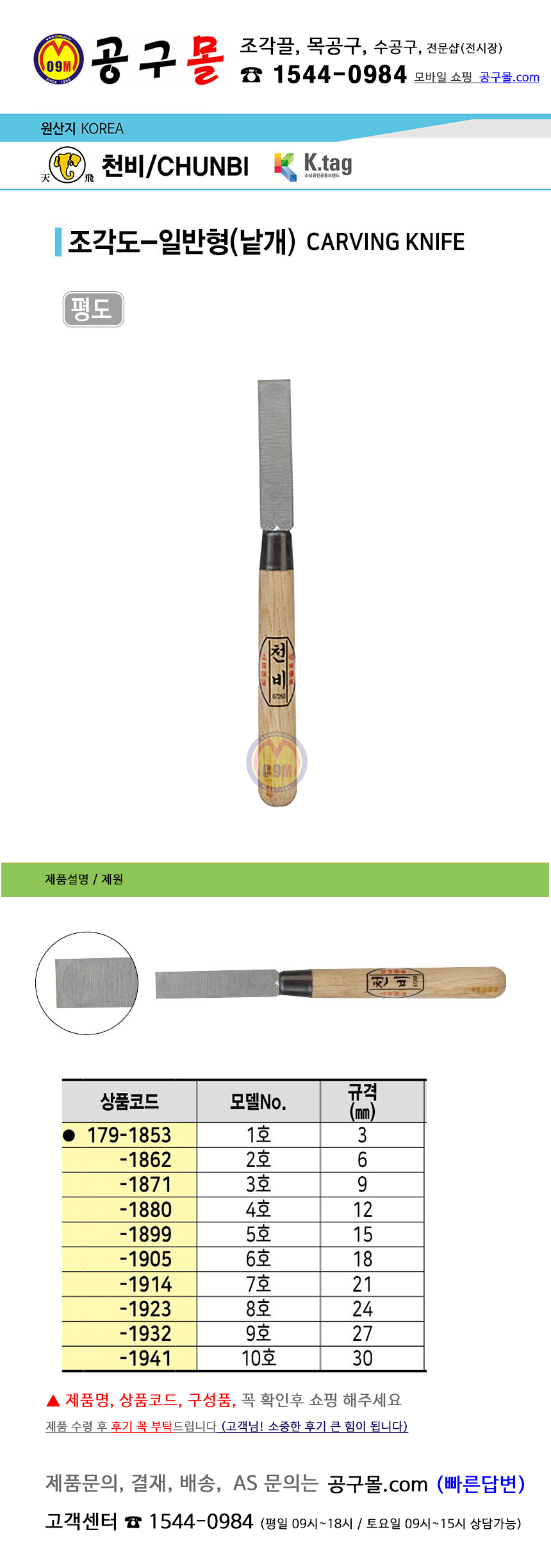 천비 조각도(평도,1P) 3호(9MM), 공구몰, 조각칼, 목공구, 179-1871