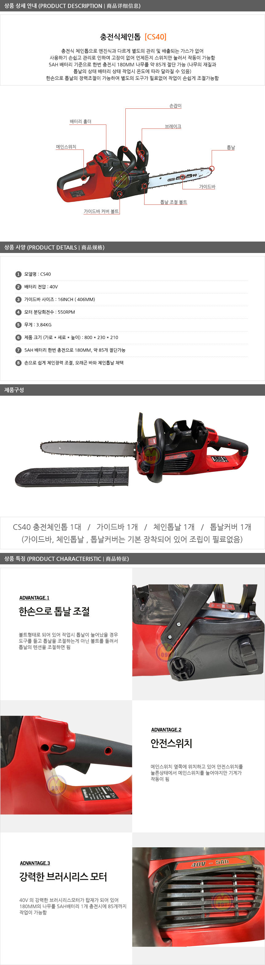 북성-40V 충전체인톱(베어툴) CS40 (배터리, 충전기별매) 북성공업, 무선톱, 울산공구몰.