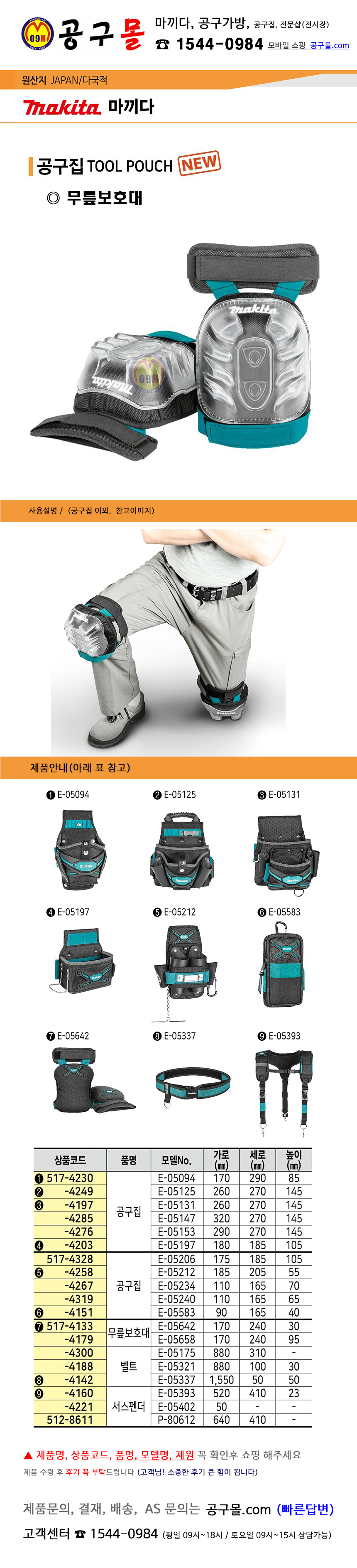 마끼다 무릎보호대 E-15615 MAKITA, 공구몰, 마루판작업, 타일시공, 517-4133
