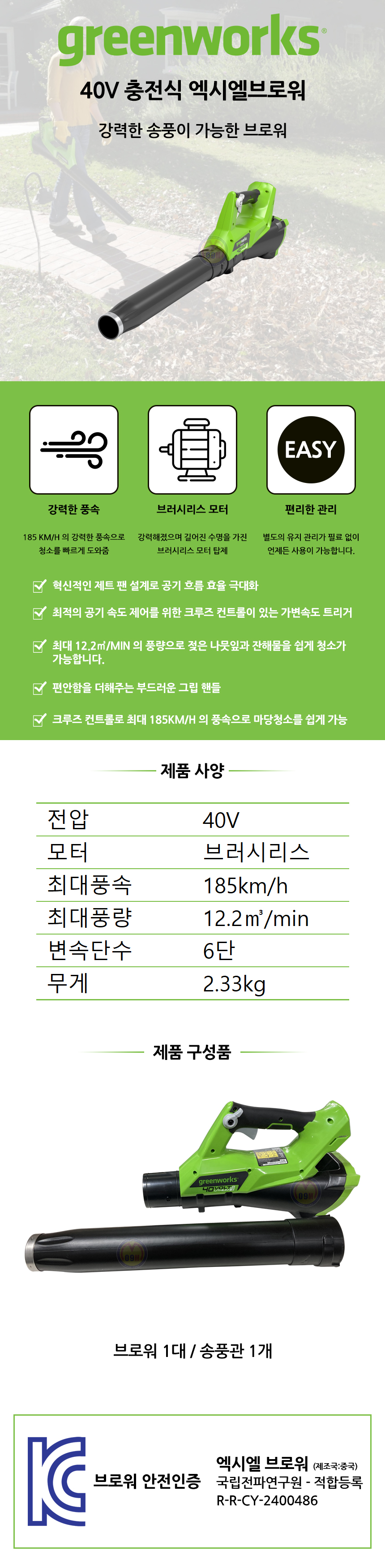 그린웍스 60V 473 엑시얼브로워 (5Ah1개 세트) 송풍기, 납엽청소기, 마당청소