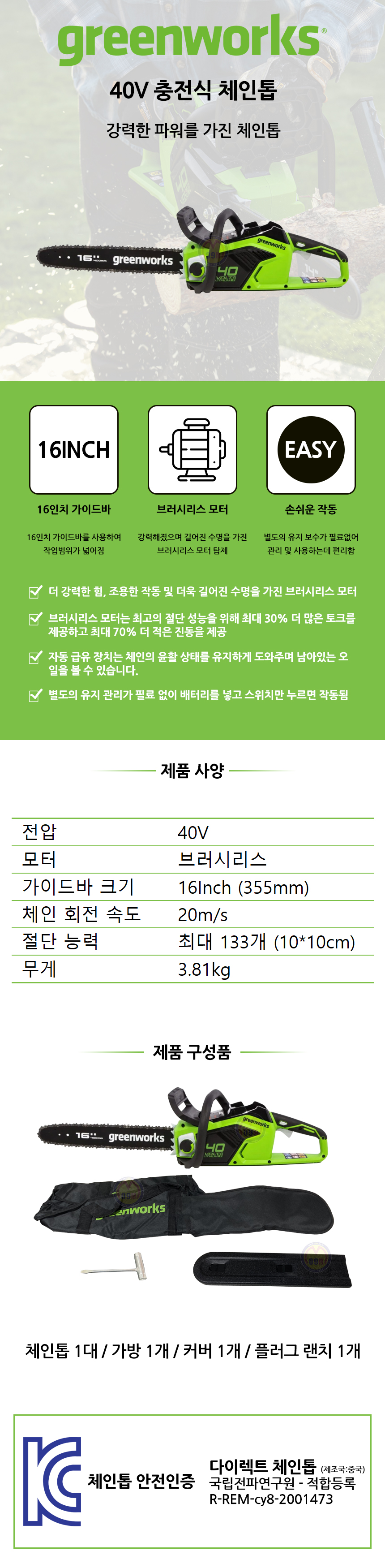 그린웍스 충전체인톱 (16) (BL,베어툴) (40V-충전기,배터리별매) 무선체인톱 충전톱