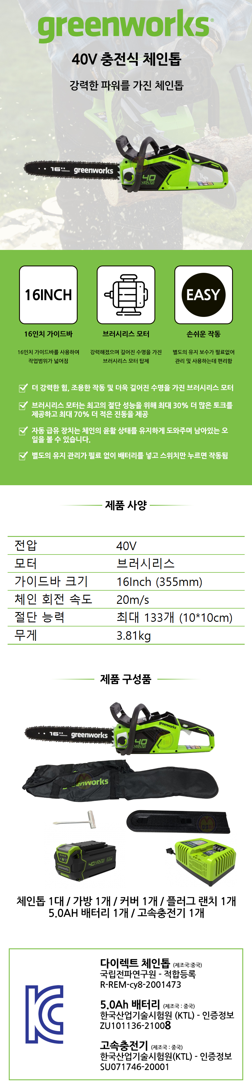 그린웍스 충전체인톱 (16) 40V-5Ah1개 세트, 무선체인톱 충전톱