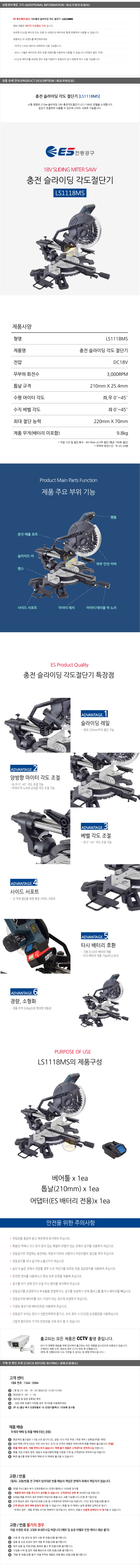 ES산업 충전 슬라이딩 각도절단기 LS1118MS(베어툴) 충전기, 18V 배터리별매,공구몰