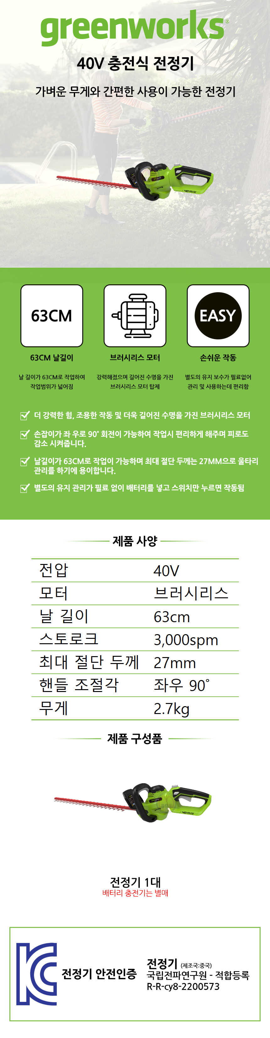 그린웍스 전정기(브러시리스) 40V-5Ah1개 세트, 헤지트리머 트리머, 전정기