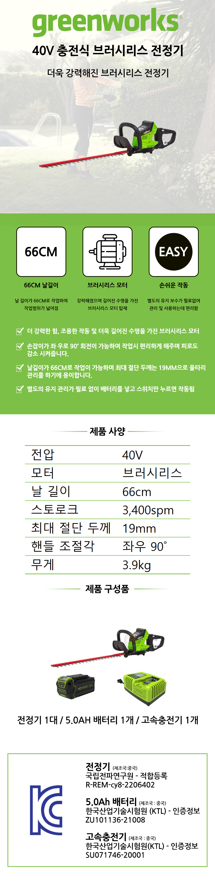 그린웍스 전정기(브러시리스) 40V-5Ah1개 세트, 헤지트리머 트리머, 전정기