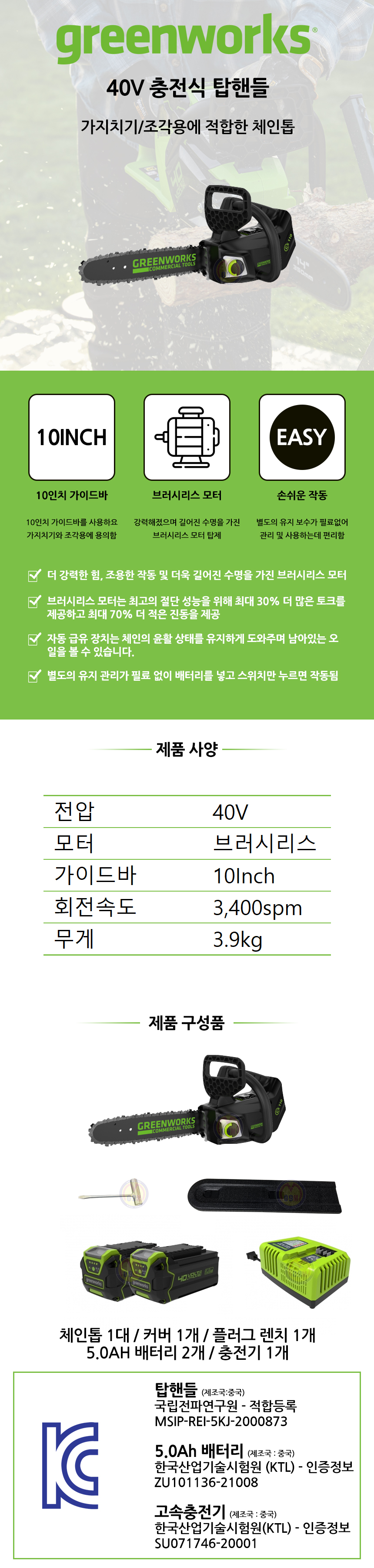 그린웍스 탑핸들톱 40V-5Ah1개 세트, 가치지기용, 무선, 충전톱(MD)