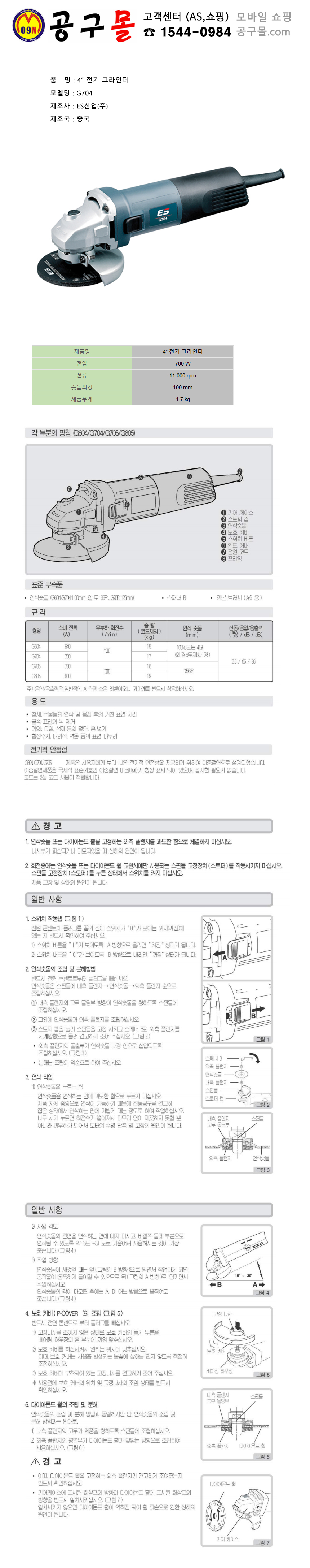 ES산업 전기그라인더 G704 700W, 이에스산업, 공구몰, 앵글그라인더, 디스크그라인더