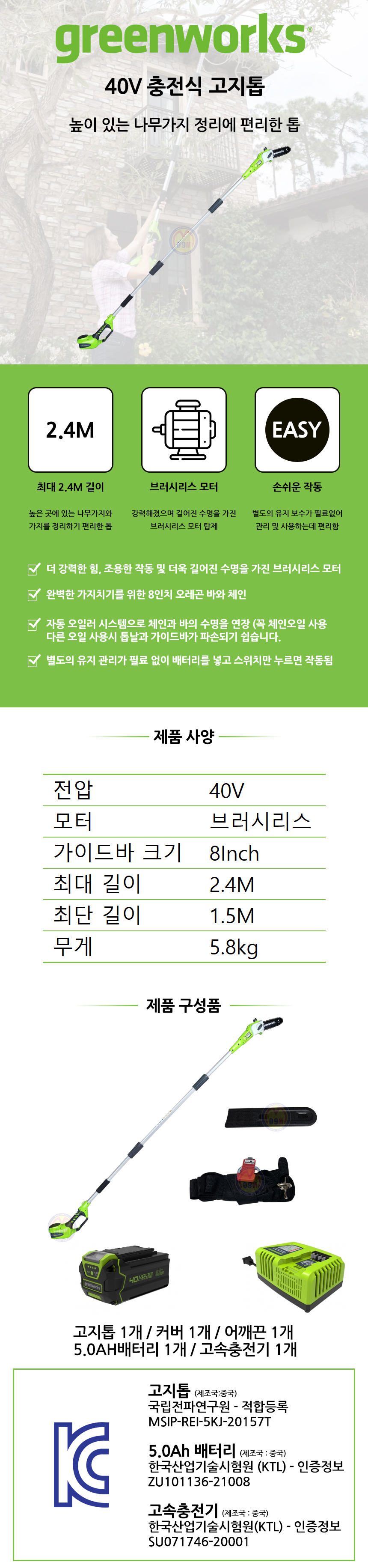 그린웍스 충전고지톱 40V-5Ah1개 세트, 가치지기용, 충전톱 고지체인톱