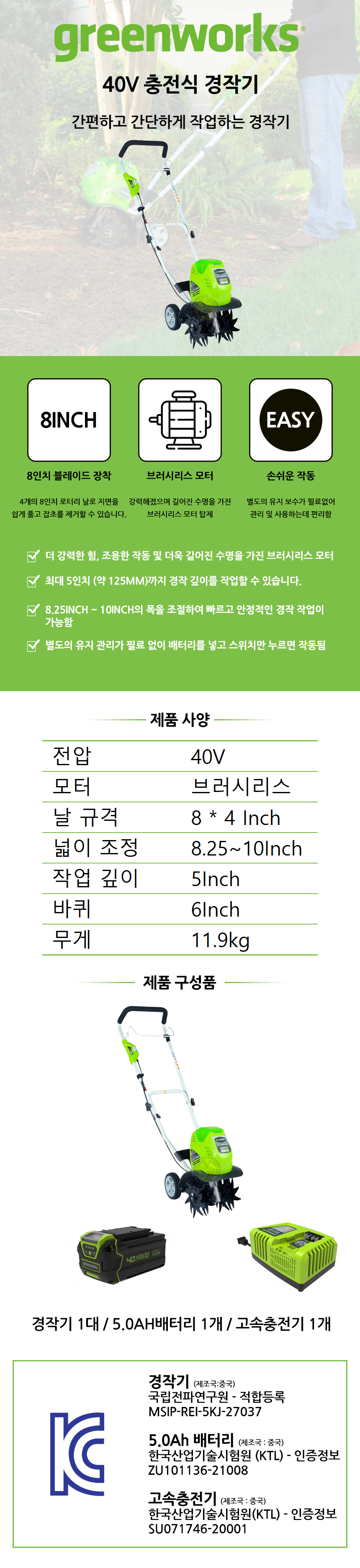 그린웍스 충전경작기 40V-5Ah1개 세트, 땅파기 텃밭관리기(MD)