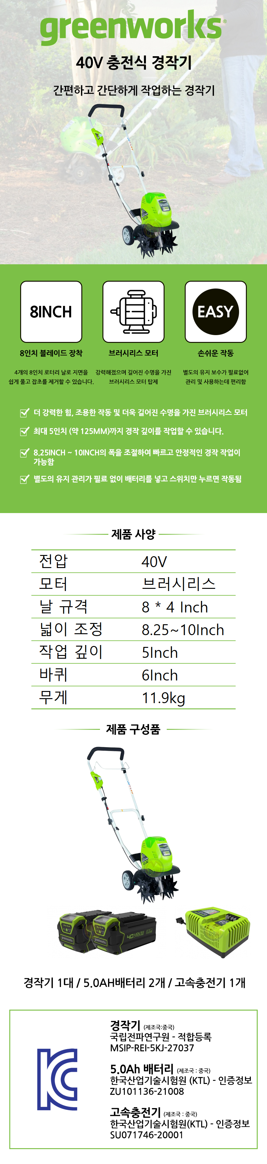 그린웍스 충전경작기 40V-5Ah2개 세트, 땅파기 텃밭관리기(MD)