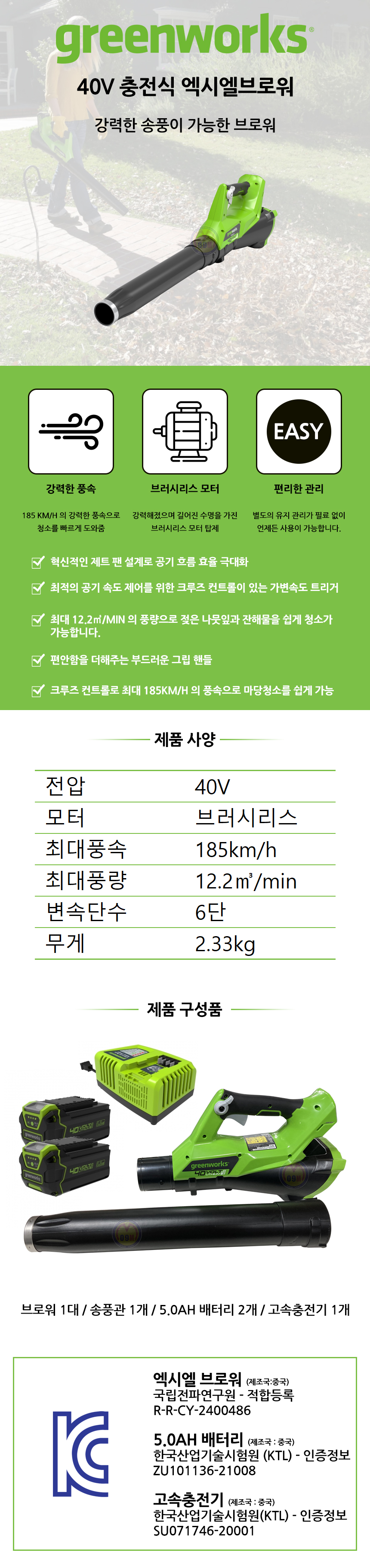 그린웍스 60V 473 엑시얼브로워 (5Ah1개 세트) 송풍기, 납엽청소기, 마당청소