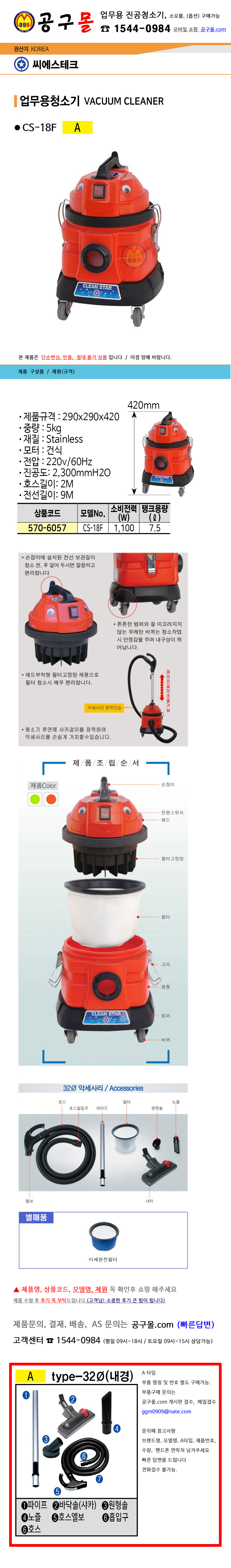 청소기(건식) CS-18F (1100W,7.5L) 씨에스테크, 공구몰, 건식청소기, 업소용청소기, 산업용청소기, 570-6057