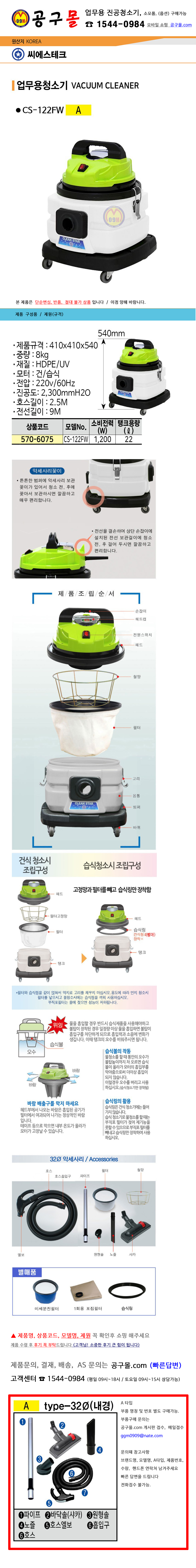청소기(건습식) CS-122FW (1200W,22L) 씨에스테크, 공구몰, 건식청소기, 업소용청소기, 습식청소기, 570-6075
