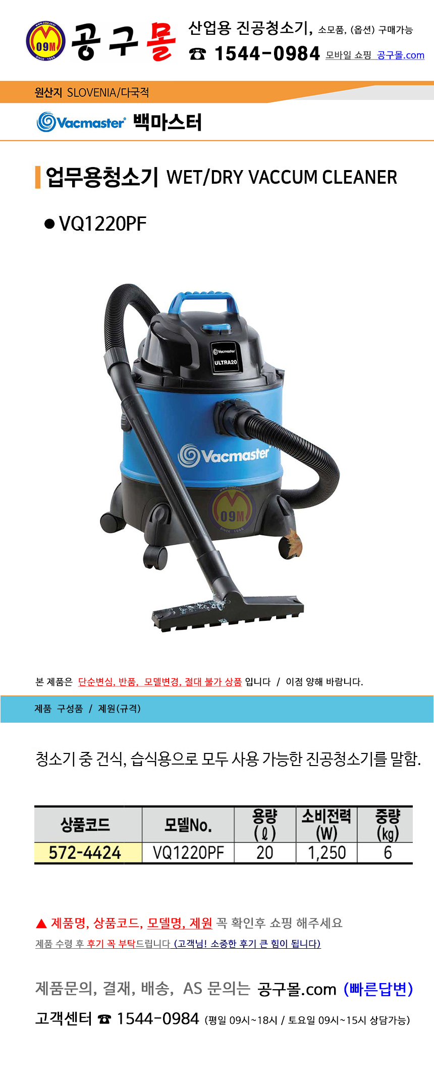 청소기(건습식) VQ1220PF (1250W,20L) 백마스터, 진공청소기, 건식청소기,습식청소기,572-4424