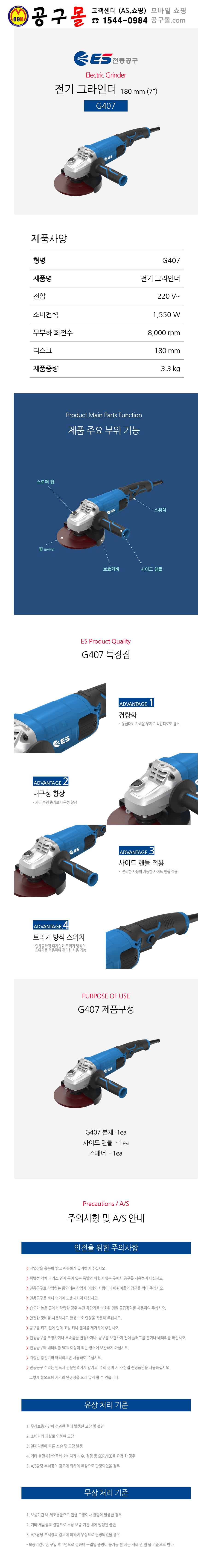 품절.ES산업 180mm 그라인더 G407, 1.550W, 8000RPM, 디스크그라인더, 앵글그라인더, 공구몰, 울산공구몰