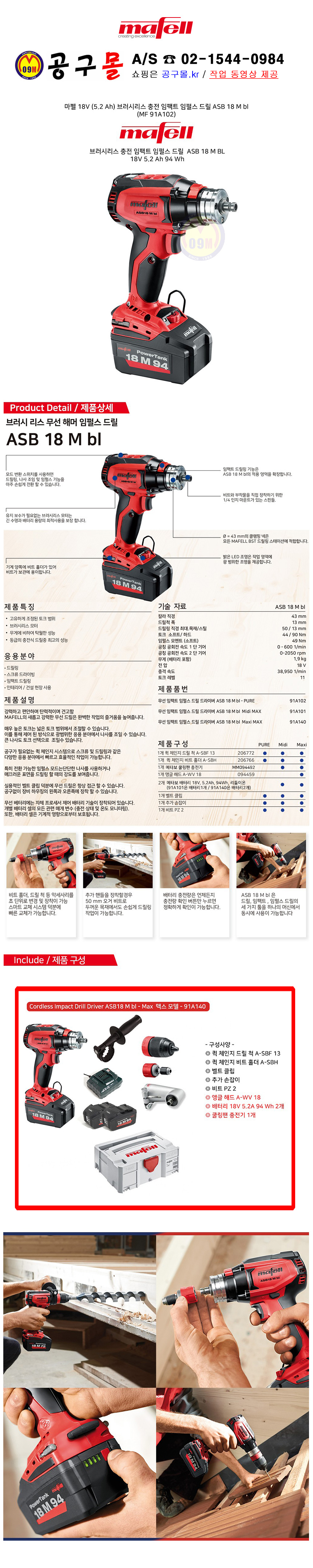 마펠 ASB18M bl (하프) 18V-5.5AH(1B) 무선 해머 임펄스드릴, MAFELL, 전동드라이버, 브러시리스 모터, 91A101-H