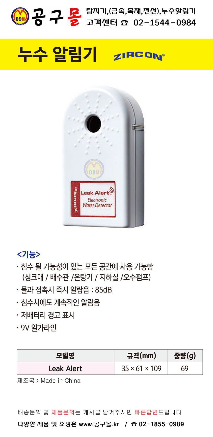 누수알림기 LeakAlert ZIRCON, 지르콘, 누수탐지기, 누수감지기, 누수예방.공구몰