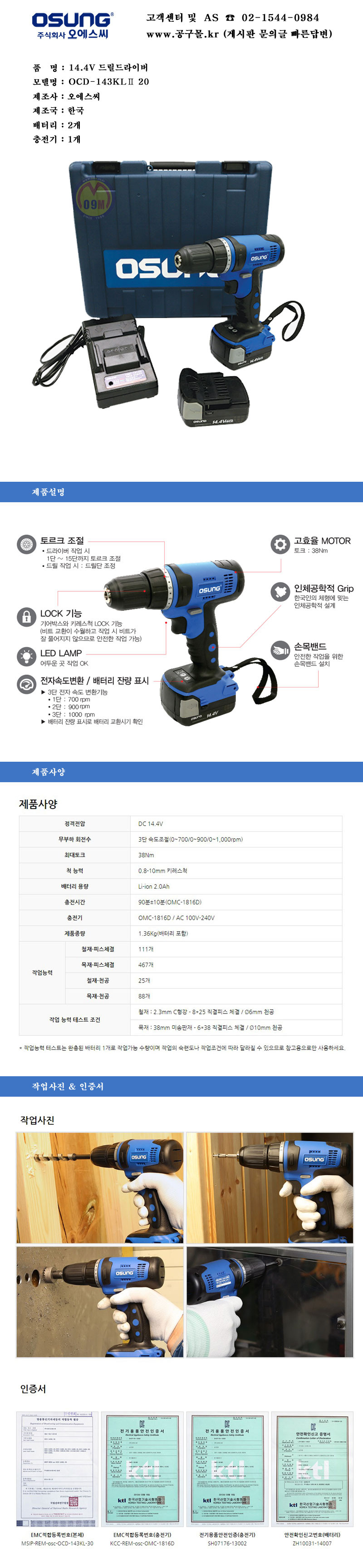 오성-충전드릴 OCD-143KL2 20(14.4V-2AH,2B), 공구몰, 2130730