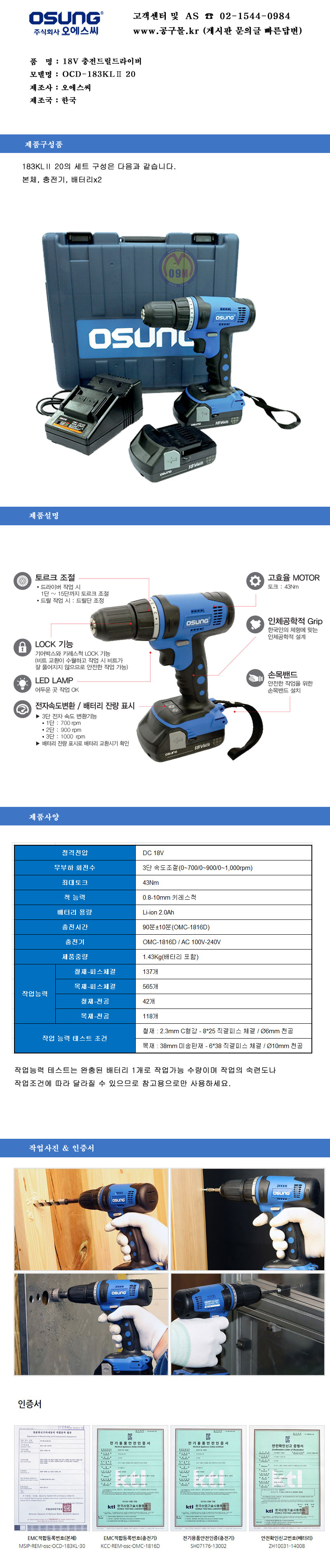 오성-충전드릴 OCD-183KL2 40 (18V-4AH,2B), 공구몰, 2130770