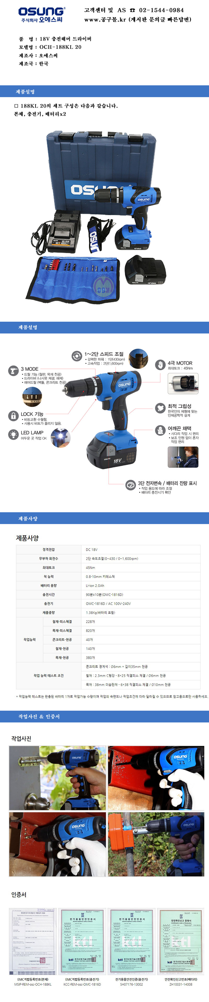 오성-충전해머드릴 OCH-188KL 50 (18V-5AH,2B), 공구몰, 2131090