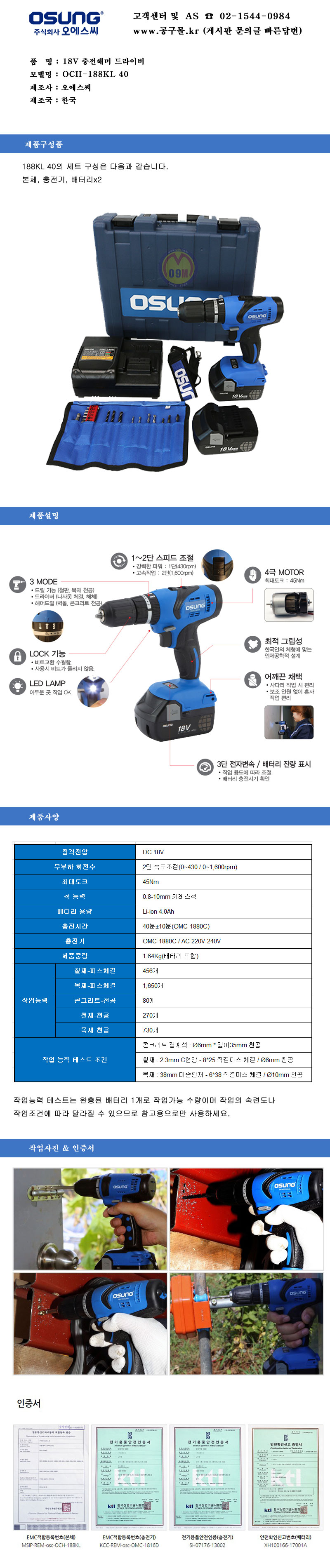 오성-충전해머드릴 OCH-188KL 40 (18V-4AH,2B), 공구몰, 2130910
