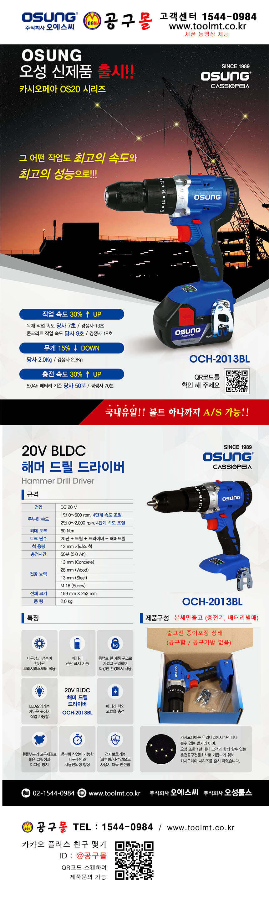 오성-충전해머드릴 OCH-2013BL 50, 18V,5Ah,2B,OSUNG, 공구몰, 2132160,해머드릴,진동드릴
