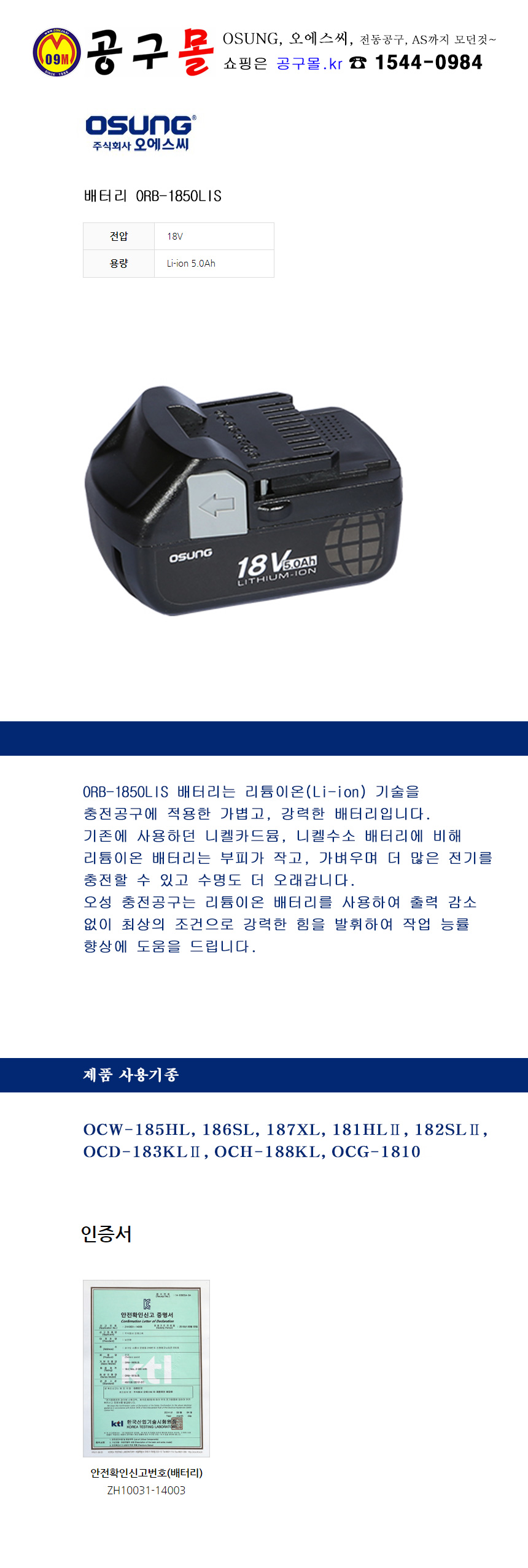 오성-리튬이온 배터리 ORB-1850LIS 18V-5.0Ah, OSUNG, OSC, 오에스씨, 전동공구, 공구몰