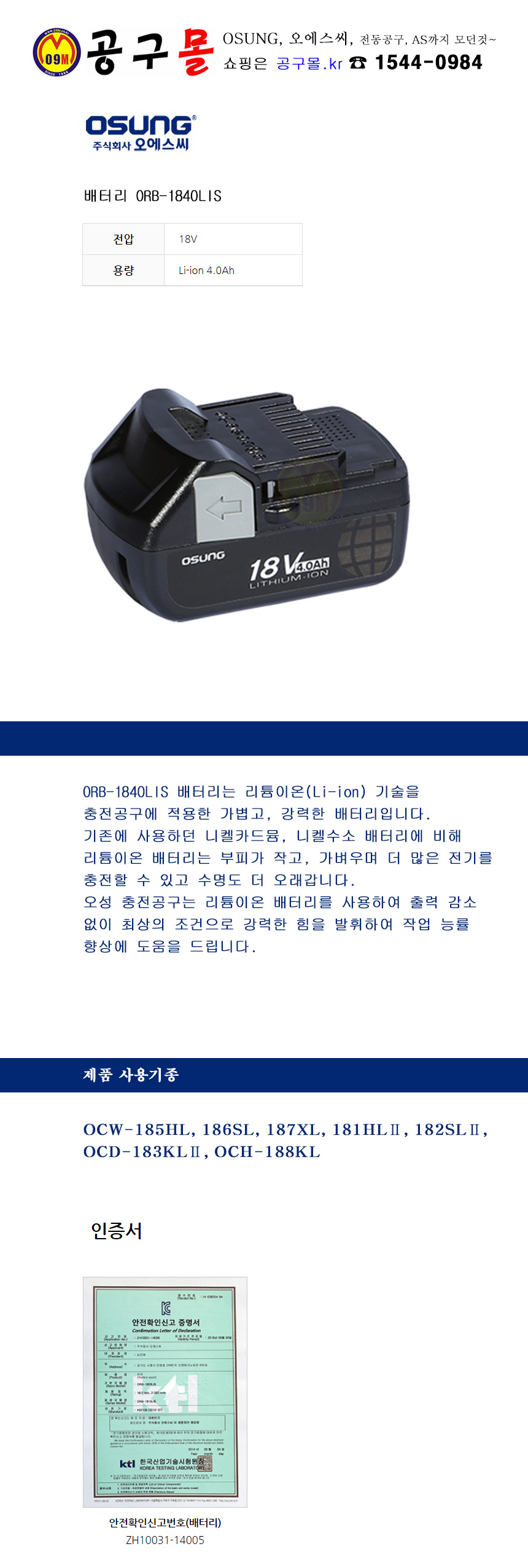 오성-리튬이온 배터리 ORB-1840LIS 18V-4.0Ah, OSUNG, OSC, 오에스씨, 전동공구, 공구몰