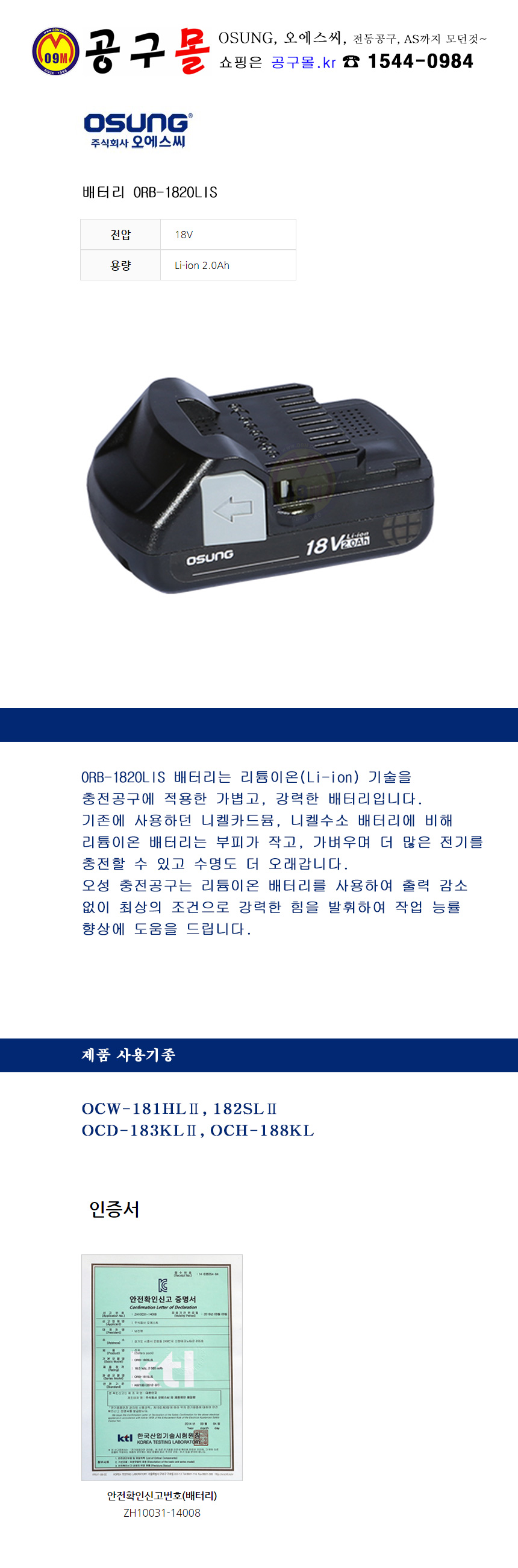 오성-리튬이온 배터리 ORB-1820LIS 18V-2.0Ah, OSUNG, OSC, 오에스씨, 전동공구, 공구몰