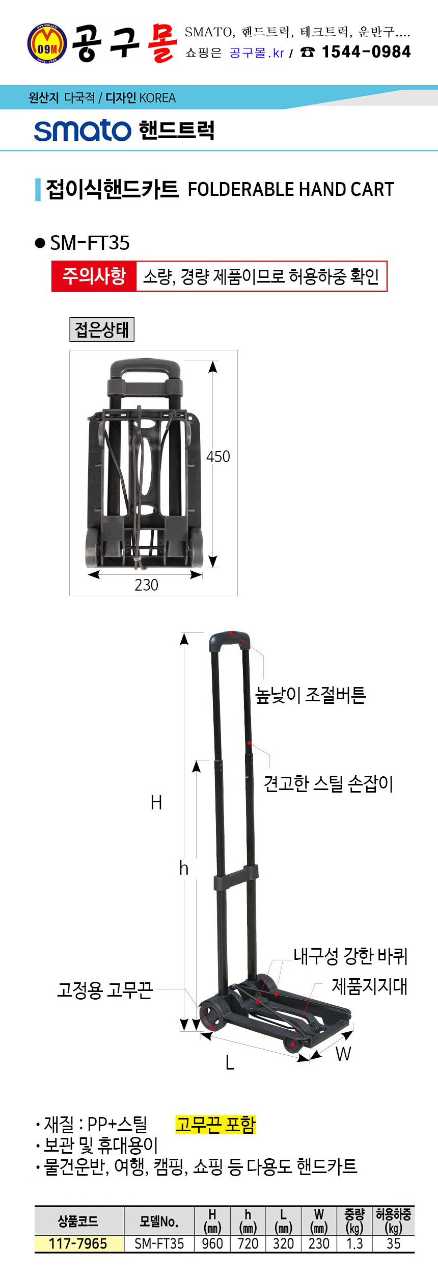 스마토 접이식핸드카트 SM-FT35 (35Kg) SMATO, 스마토, 핸드카트, 핸드캐리어, 공구몰, 117-7965