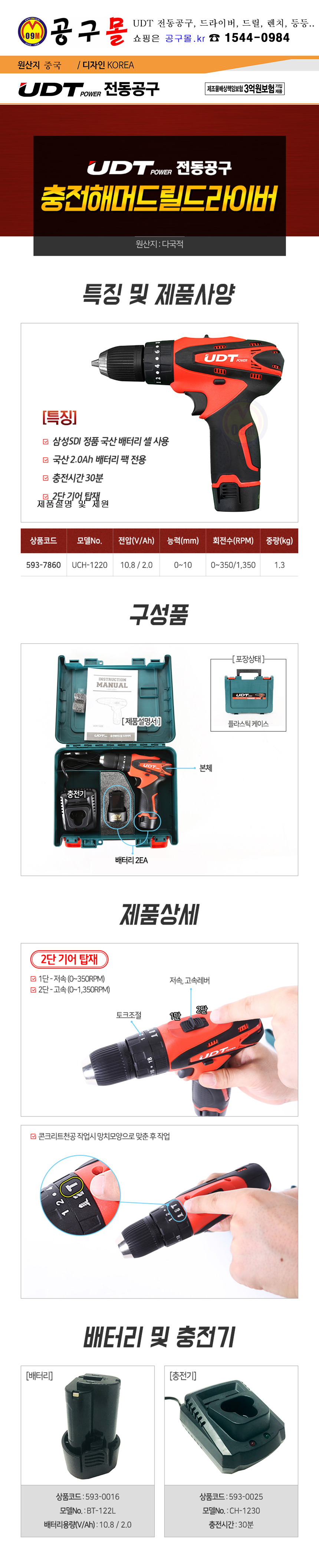 UDT 충전해머드릴드라이버 UCH-1220(10.V,2Ah) UDT 전동공구, 해머드릴, 공구몰, 593-7860