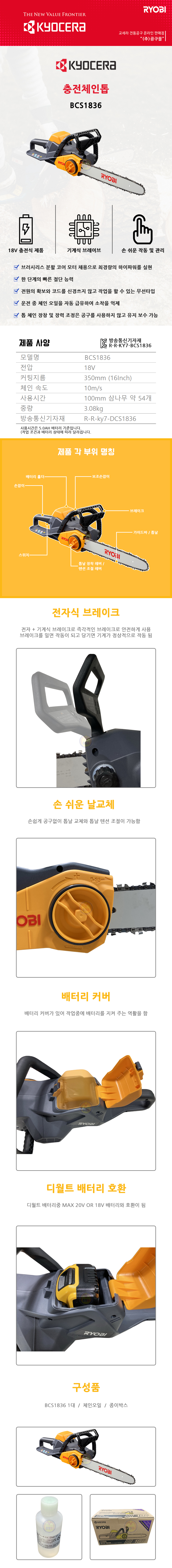 교세라 18V 충전체인톱 BCS-1836 (18V-베어툴) 체인톱, 충전톱, 전기톱, 무선톱, 가정용톱(MD)