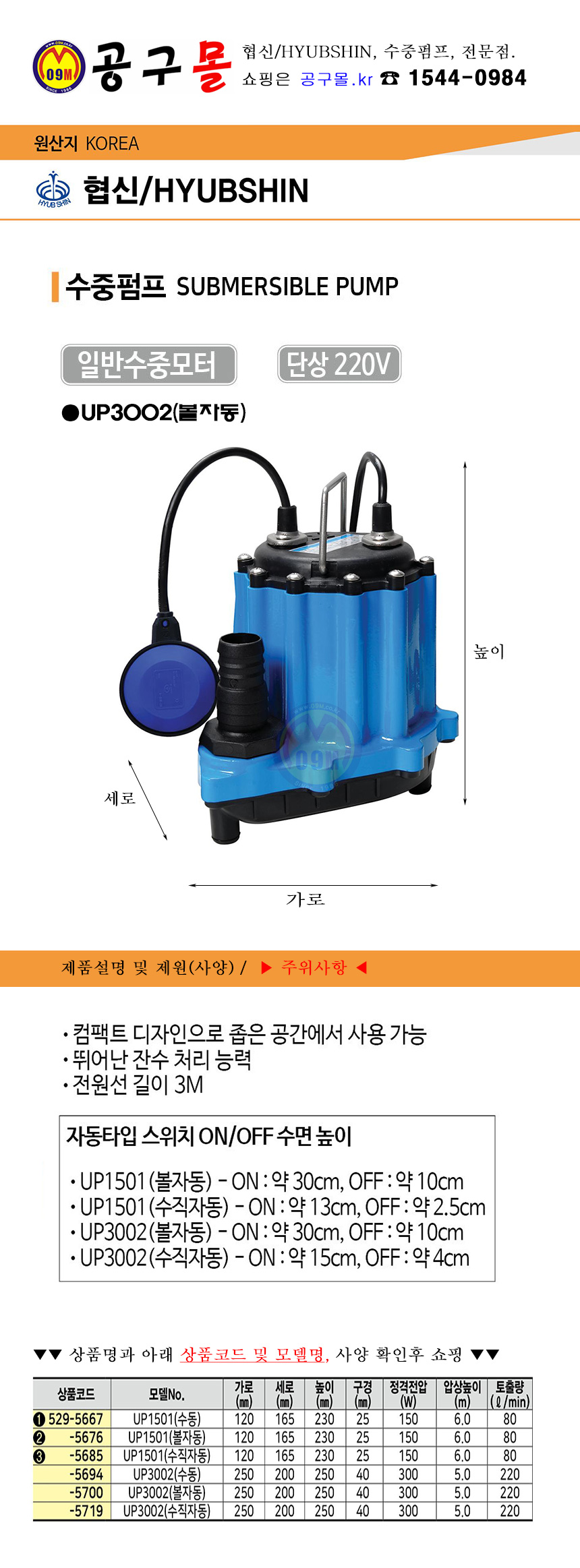수중펌프 UP3002(수직자동)-220L, 협신, HYUBSHIN, 원예용펌프, 농업용펌프, 조경용펌프,공구몰, 529-5719