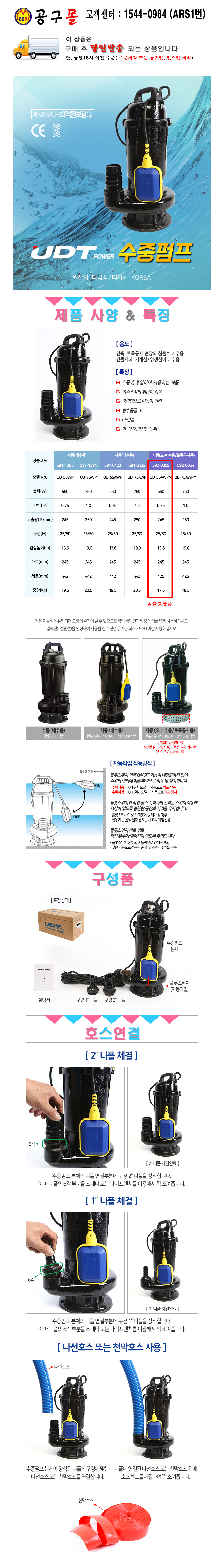 UDT 수중펌프(자동) UD-55AWPC (0.75HP) 220V 공구몰, UD55AWPC, 593-5738