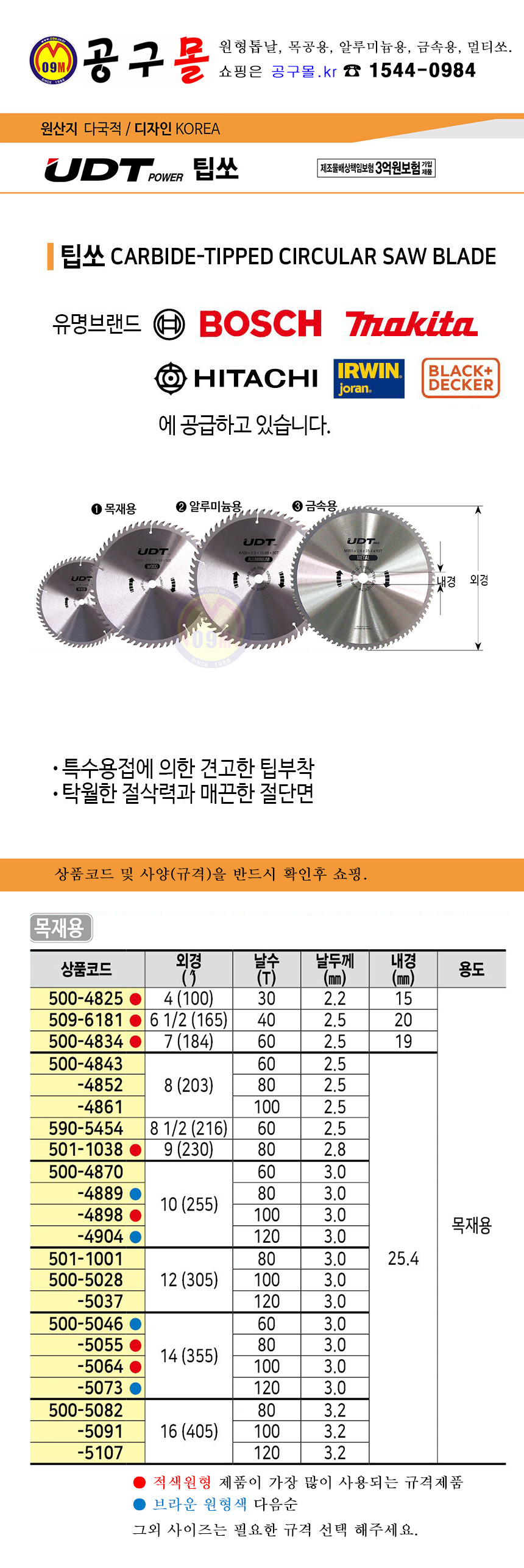 UDT,팁쏘(목재용) W255mm(10)x80T UDT팁쏘, 원형톱날, 목공용톱날, 공구몰, 500-4889