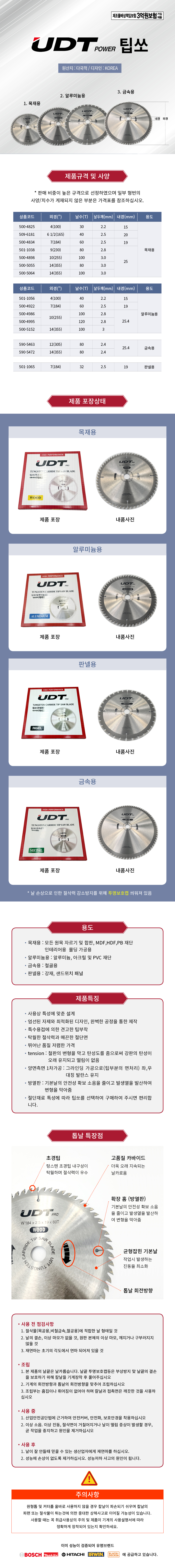 UDT,팁쏘(멀티쏘) 185mmx60Tx19mm UDT팁쏘, 목재,금속 원형톱날, 패널용톱날, 공구몰, 501-0996