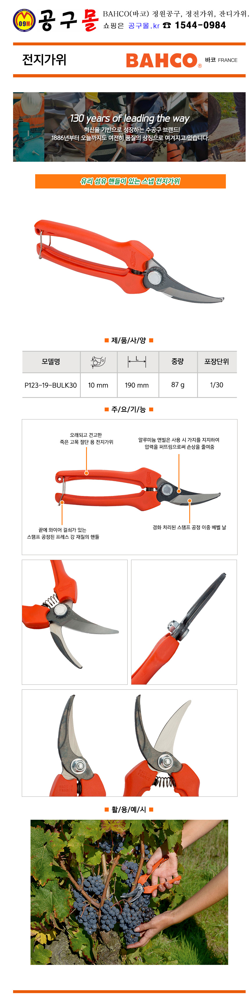 전지가위 P123-19-BULK30 L190mm, BAHCO, 정원공구, 전기가위, 공구몰, 7311518218218
