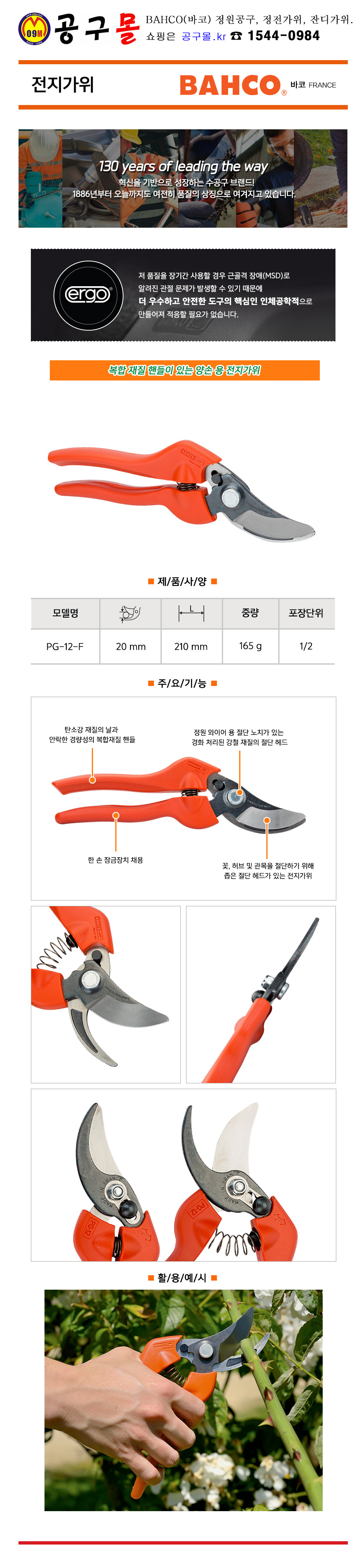 전지가위 PG-12-F L210mm, BAHCO, 정원공구, 전기가위, 공구몰, 7311518269715