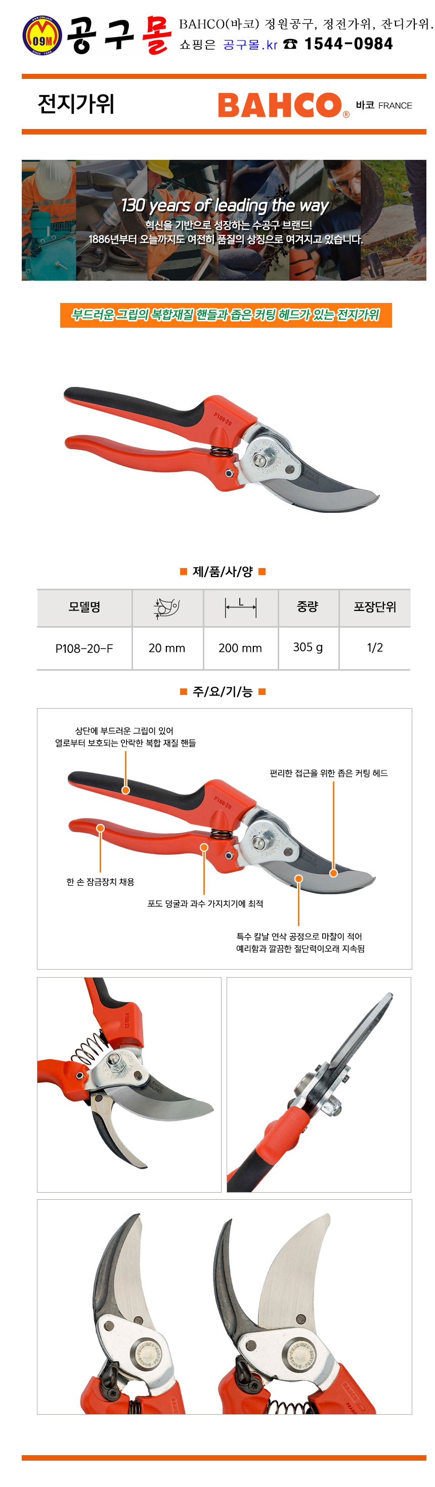 전지가위 P108-20-F L200mm, BAHCO, 정원공구, 전기가위, 공구몰, 7311518275518