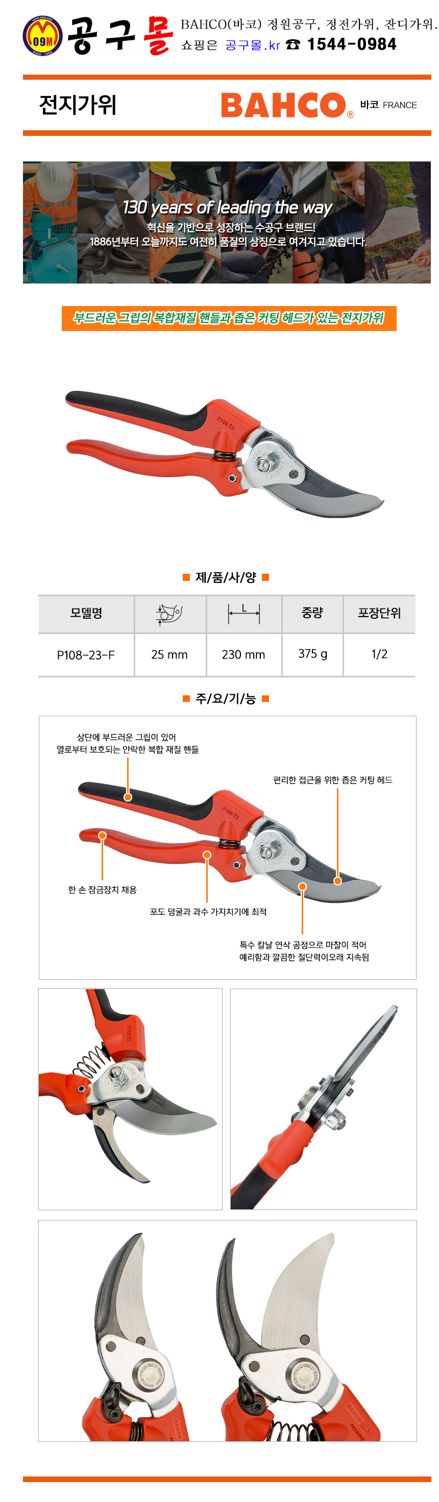 전지가위 P108-23-F L230mm, BAHCO, 정원공구, 전기가위, 공구몰, 7311518275525