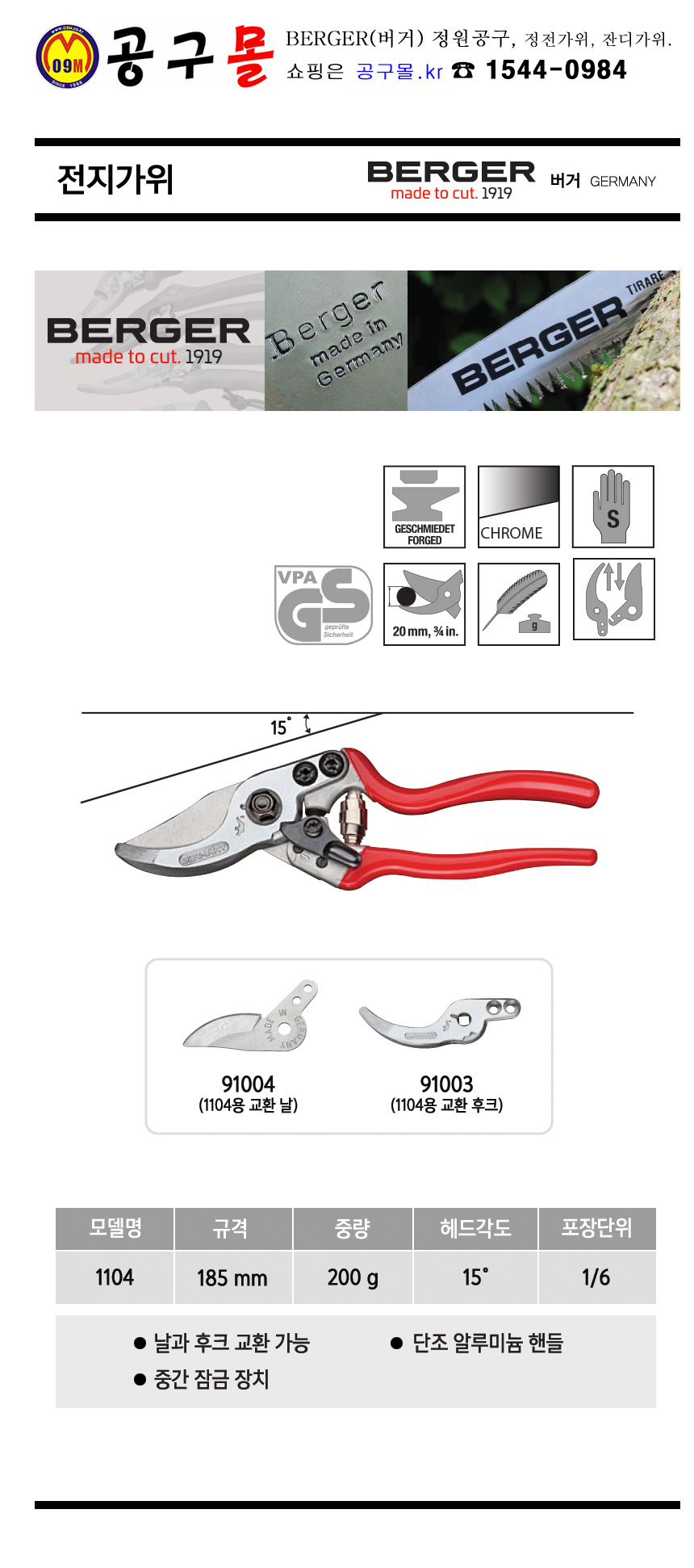 전지가위 1104 (185mm) BERGER, 버거, 독일제품, 정전가위, 원에공구, 조경공구, 공구몰