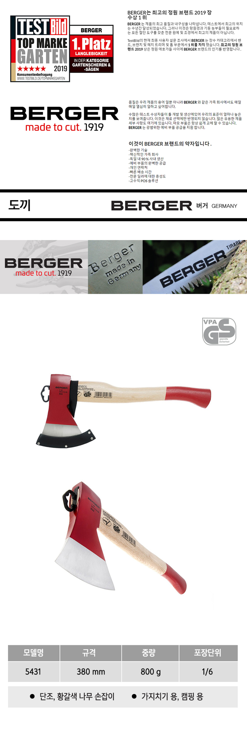 도끼 5431 380mm BERGER, 버거, 손도끼, 캠핑용도끼, 공구몰