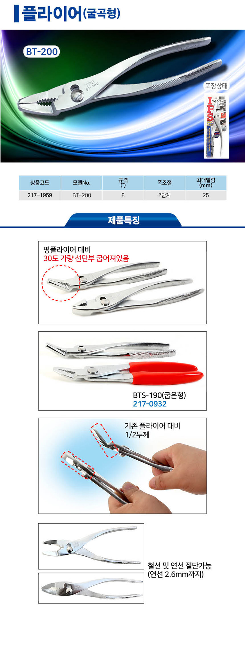 플라이어(굴곡형) BT-200 (200mm) IPS, 아이피에스, 수공구, 작업공구,217-1959