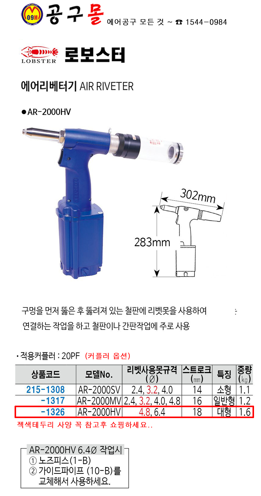 로보스터 에어리벳트기 AR-2000HV (6.4) LOBSTER, 에어리벳건, 215-1326